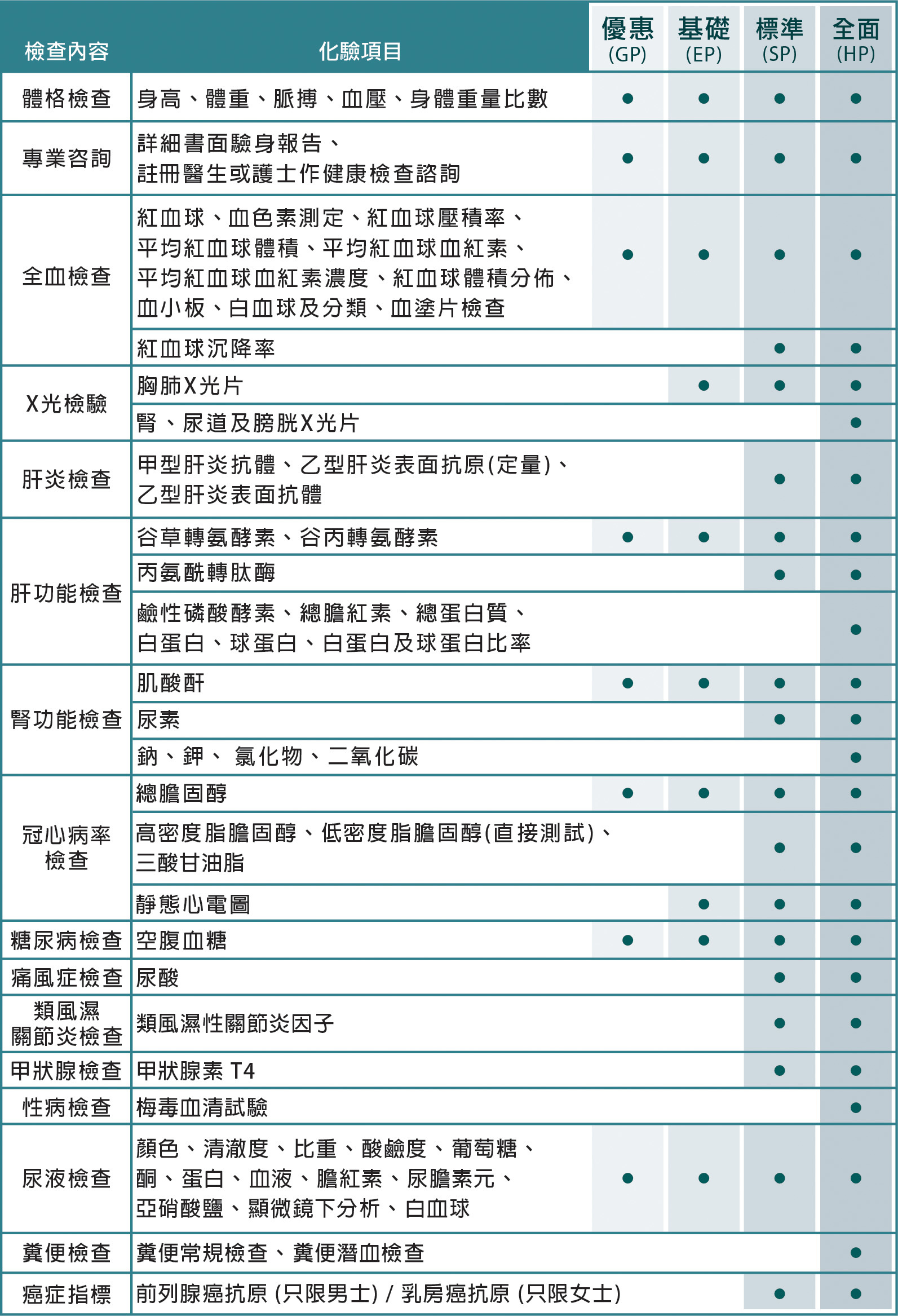 身體檢查計劃比較表