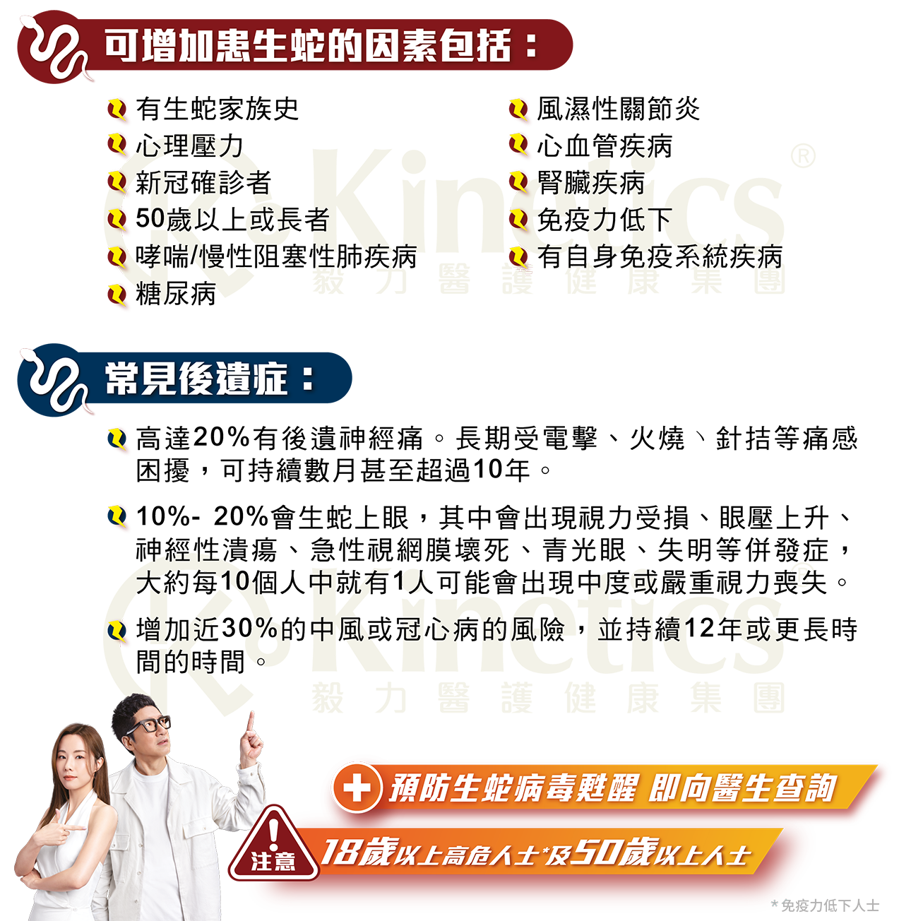 「生蛇」(醫學名稱:帶狀皰疹)是潛藏在體內的水痘病毒所引起呈帶狀的紅疹。水痘愈合後,病毒會潛藏在人體神經裡處休眠狀態,永遠不會離開你的身體,因此只要曾出過水痘,就有機會生蛇。神經與皮膚相連的任何地方都有機會生蛇,95%的成年人均有生蛇風險。生蛇可持續長達30天,所產生的疼痛更遠超你想像。