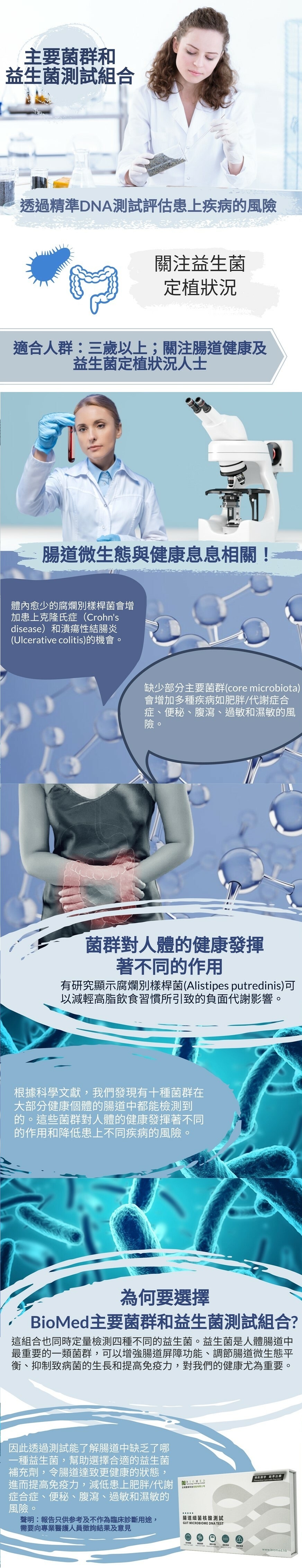 利用實時螢光定量 PCR 技術,針對特定腸道細菌菌種 (gut microbiota) 進行定量 DNA 檢測,經過數據分析後,評估患上肥胖/ 代謝症合症、便秘、腹瀉、過敏和濕敏等風險,及改善或預防益生菌補充方案。