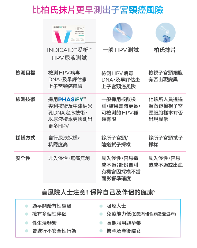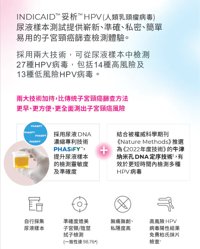 INDICAID 妥析 HPV (人類乳頭瘤病毒) 尿液樣本測試提供嶄新、準確、私密、簡單易用的子宮頸癌篩查檢測體驗。