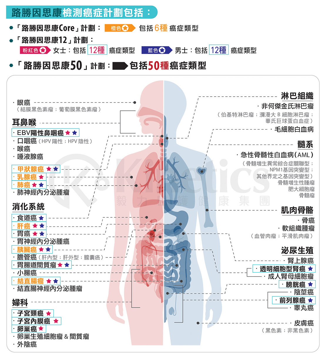 多種癌症早期篩檢項目清單: https://www.kinetics.hk/leaflet/insight-list.pdf