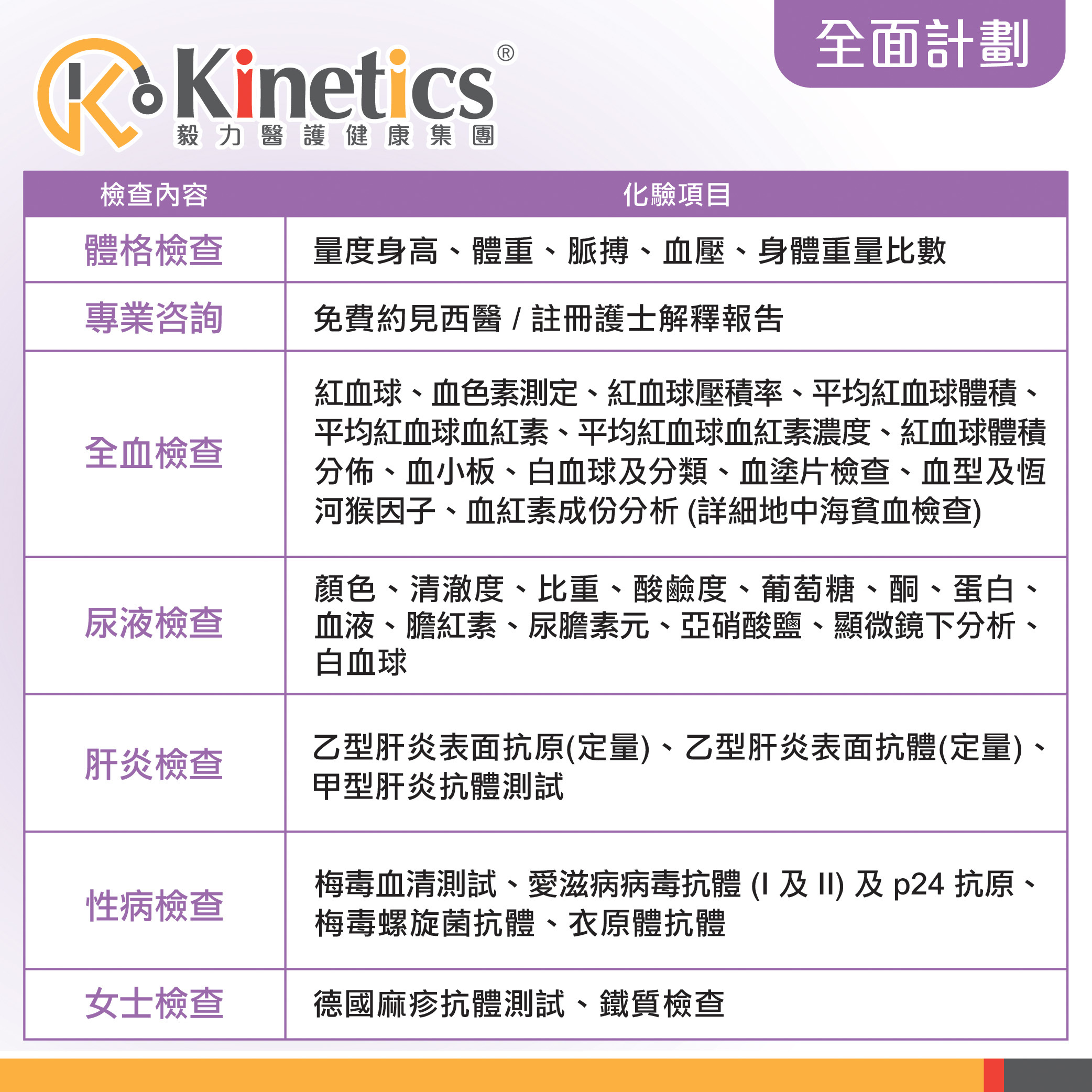 血色素測定、紅血球壓積率、平均紅血球體積、平均紅血球血紅素、平均紅血球血紅素濃度、紅血球、紅血球體積分佈、血小板、白血球及分類、血塗片檢查