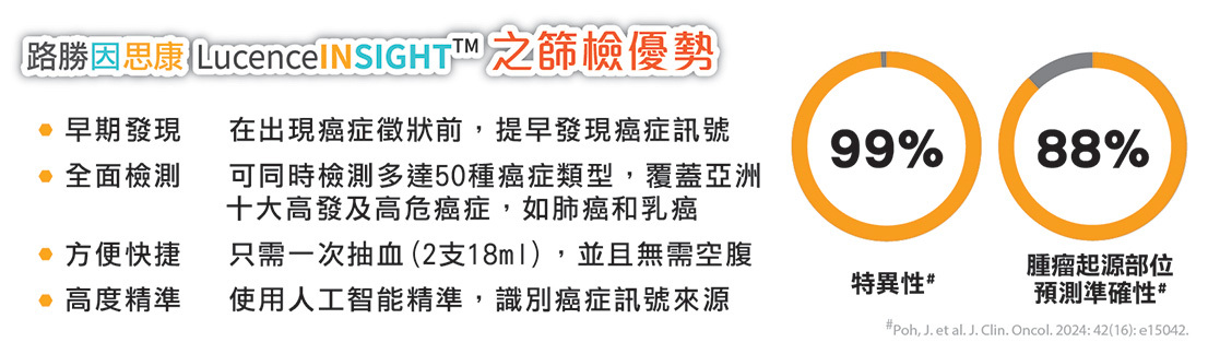路勝因思康™(Lucence INSIGHT™)是一種採用次世代定序(NGS)技術的多種癌症篩檢。一次抽血,可以同時檢測高達50種高發及高危癌症,包括肺癌、乳腺癌、結直腸癌等。